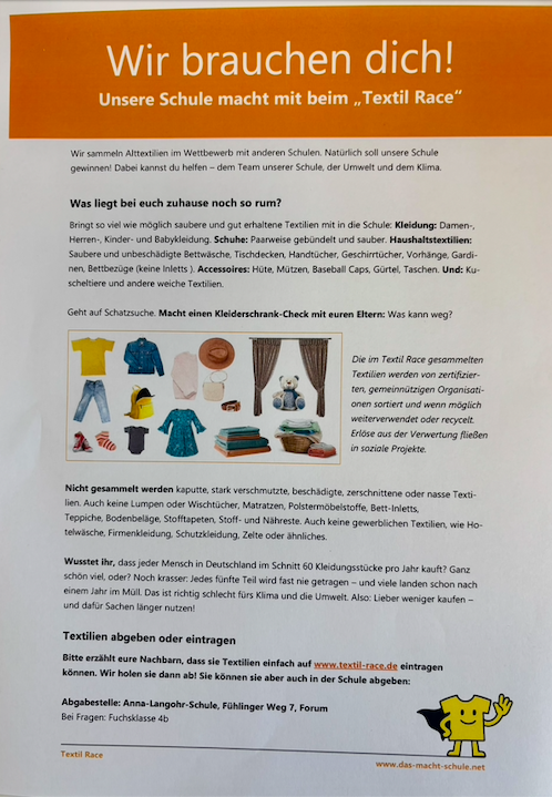 Wir, die Fuchsklasse der Anna-Langohr-Schule machen bei einem Altkleidungssammelwettbewerb mit. Ihr könnt uns gerne helfen.